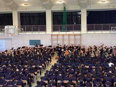 チャイコフスキーの弦楽4重奏やドヴォルザークの交響曲第9番「新世界より」など、私たちにも馴染みのある楽曲が披露されました。後半では代表生徒が指揮に挑戦するなどあっという間の一時間半でした。