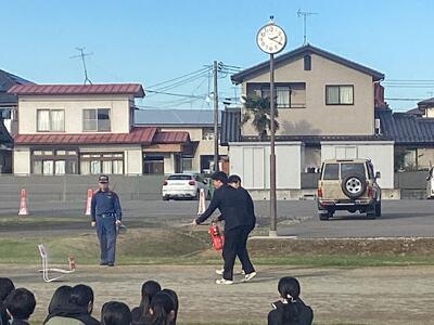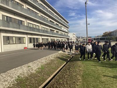 11月5日(水)6校時、石巻消防署南分署の隊員の方々に協力をいただき、火災を想定した避難訓練を実施しました。今回は、生徒昇降口付近から出火した想定での避難となりました。広い昇降口が使えないということで、混雑が予想されましたが、生徒たちは落ち着いて、校庭に通じる出口からうまく分散して落ち着いて避難することができました。