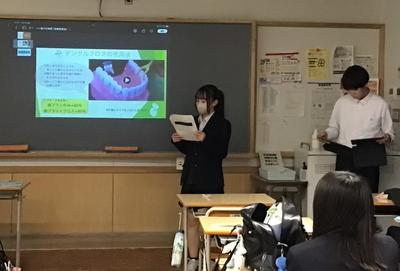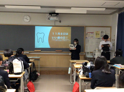 11/8の「いい歯の日」にちなみ、11/4~11/7に1・2年次保健委員が歯の保健指導を行いました。歯ブラシ、デンタルフロスを1人1本ずつ配布し、デンタルフロスの効果や使用方法について説明しました。