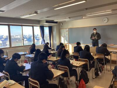 はじめに、校長先生から激励のメッセージが送られ、受験生たちは翌日から始まる試験に向けて決意を新たにしていました。そして年次主任の先生、担任の先生からの心温まるメッセージや、実体験をふまえたアドバイスなどが続きました。最後に進路担当の先生から、受験上の諸注意や前日の過ごし方など本番に向けての最終確認があり、激励会を終えました。