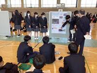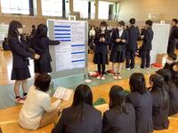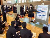 3月15日の1~4校時、体育館において「分野別課題研究ポスター発表会」を行いました。発表する2年次の生徒全員と発表を聞く1年次の生徒全員が集まり、多賀城高校と古川黎明高校の生徒41名にも参加していただきました。さらに、石巻専修大学から4名、宮城学院女子大学から4名、東北福祉大学から2名の先生方にご来校いただきました。