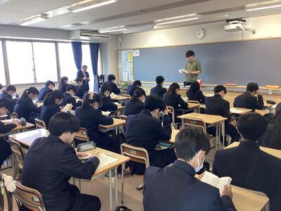 3月17日(月)5、6校時、卒業生講話を実施しました。総合型、学校推薦型、一般選抜で大学合格した卒業生と、公務員や高等看護学校に合格した卒業生から、在校生に次のようなメッセージが語られました。