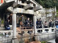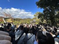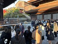 12月2日午後、京都に到着しました。その後、金閣寺、清水寺を見学しました。見学先は紅葉が見頃で観光客がたくさんいましたが、教科書でしか見たことない金閣寺を見学したり、清水寺では「清水の舞台」や「音羽の滝」を見学したりしました。