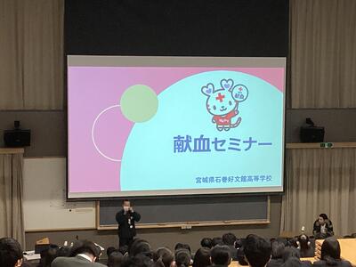 12月6日(水)、 本校白梅ホールにて、宮城県赤十字血液センター事業部献血推進課の新田光さんと、プロスノーボーダーの荒井daze善正さんのお二方に来校いただき、1年次生を対象とした「がん・献血セミナー」を実施しました。新田さんには、献血について6つの項目(①献血とは何か、②献血の種類、③採血の基準、④献血の流れ、⑤献血の現状、⑥献血できる場所)から講話をいただきました。その中でも印象に残っている言葉は、「献血の現状として、毎日1万4千人の献血への協力が必要である」というものです。それにも関わらず、10代から30代の献血者推移はこの10年間(2010年~2020年)でおよそ37%(約100万人)も減少しているというデータに、他人事ではなく当事者意識を持って献血に協力していこうと思いました。プロスノーボーダーの荒井daze善正さんからは、がんとの闘病について大変貴重なお話をいただきました。