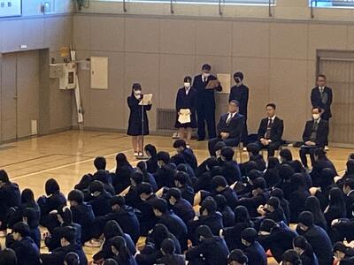 はじめに、能登半島地震の犠牲となった方々へ黙祷を捧げ、「必要な情報を知り、被災者のために何ができるか考えよう」と校長先生から話がありました。そして、音楽家ロベルト・シューマンのユーゲントアルバムにある『難しいものを平凡に弾くより、易しい曲を上手に、美しく弾けるよう努力すること』や『学ぶことに終わりはない』をはじめとした言葉が紹介され、「未来をつくるのは自分自身。魅力的な社会人になるよう、日々の目標を持ち、自分を信じて夢に向かおう」とのメッセージをいただきました。