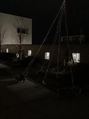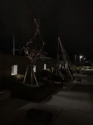 ② 生徒会が生徒昇降口のそばの植木をLED電球で装飾しました。日中の太陽の光で、夕方は自動で明るくなる仕組みです。下校するとき、明るく道を照らしてくれ、気持ちまで明るくなります。