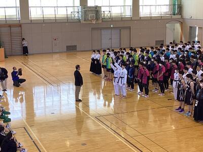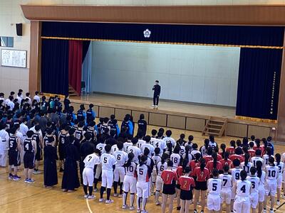 5月2日総体壮行式を行いました。校長先生から「チームとグループの違いの話があり、部員全員がチームの一員、各自の役割を自覚して、とことん頑張ってきてください」と、生徒副会長からも「今日は、応援練習以上に大きな声で応援するので、頑張ってください」と激励の言葉がありました。その激励に応えるように、各部からの決意表明、選手を代表して空手部の主将と副主将が「これまで支えてくださった、すべての人に感謝して戦い抜きます」と宣誓しました。その後、チアリーディング部が中心となって応援をしました。