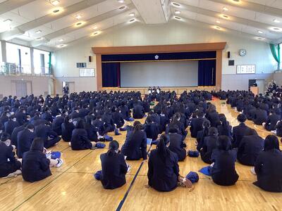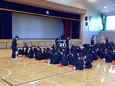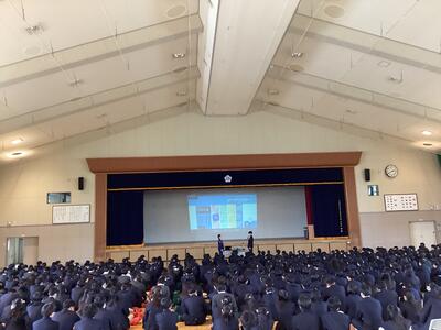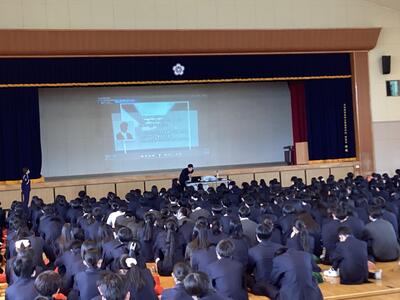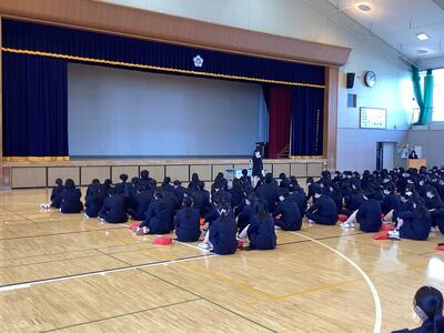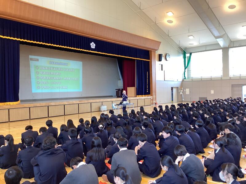 本校では約35%の生徒が自転車通学をしており、自転車を利用する当事者として、気持ちを新たにしているようでした。また、運転する側だけではなく、自動車に同乗していたり、徒歩であっても自転車の存在は無視できません。皆、しっかりと講話に聞き入っていました。