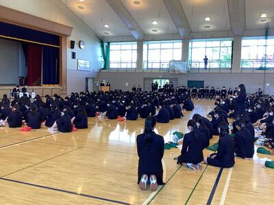 5月10日(金)に前期生徒総会が開催されました。初めに、生徒会長から「周りに流されず、自分の意見をしっかり持ってのぞんでくだい」と挨拶があり、続いて、議長が選出されました。生徒会会計報告、予算の審議が行われた後、各委員会からは、文化祭のテーマ発表や自転車通学者へのヘルメット着用への呼びかけ等がありました。