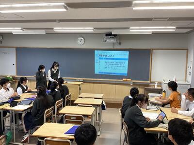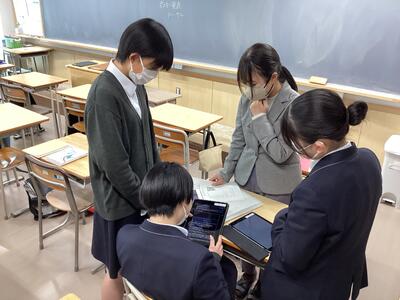 ・SDGs探究活動を振り返って、最初はテーマがまとまらず、スライドが完成するのか不安だったけれど、各メンバーが協力しなんとか形にすることができて良かったです。活動を行うごとにグループの協調性が高まっていき、互いに苦戦していた時は助け合えるようになりました。21日の全体発表に向けて、班のみんなで改善点や工夫点について話し合ったり、発表原稿を作ったり、緊張しないように何度も練習したりして、今までの活動の集大成を見せられるように頑張ります。