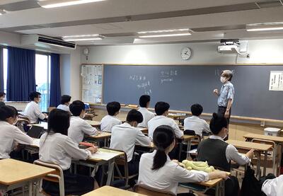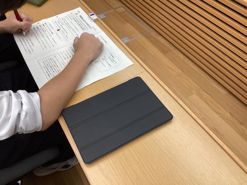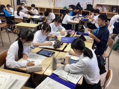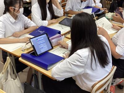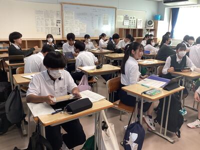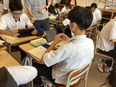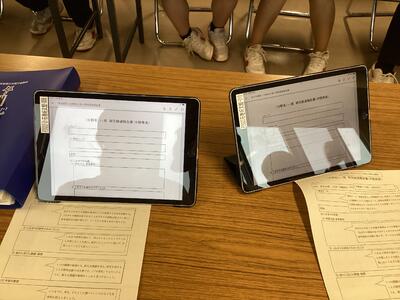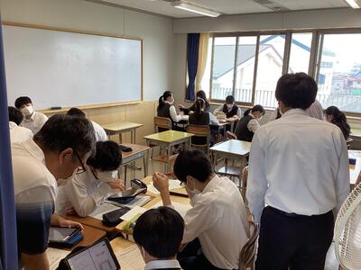 9月6日の2年次「甲斐たいむ」は、「グループごと研究活動」。分野ごとの教室に分かれてグループごとに活動しました。開始時に各班の班長のみ別室に集合して、10月の中間発表に向けてのオリエンテーションがありました。発表に必要なデータをiPadで受け取り、教室に戻って研究グループのメンバーに配布し、本格的に動き出しました。