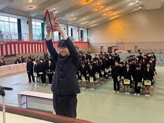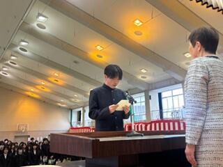 同窓会入会者代表の阿部君の挨拶の中でも、部活動や生徒会活動に明け暮れ、あっという間の3年間を駆け抜けた、とても充実していたと振り返り、これから責任ある成人の一人として「甲斐ある人になってまいります」との弁、また、記念品を代表して受け取った木村君も、たくましい背中としっかりとした足取りで頼もしく、これからの活躍が本当に楽しみです。今年の入会記念品も「ふくさ」を、白梅の刻印入りで贈呈させていただきました。