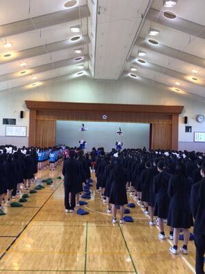 5月2日に壮行式を行いました。今年度もコロナウイルス感染症拡大防止の観点から,地区総体において応援ができないため,応援委員が中心となって全校生徒で運動部にエールを送りました。また,チア部によるパフォーマンスも行い,運動部を激励しました。