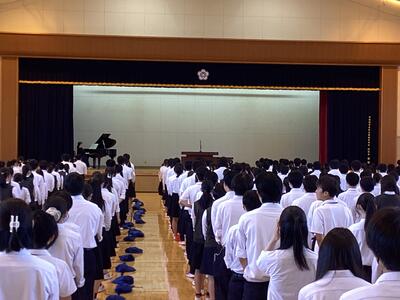 最後に、生徒指導部から、夏季休業中の生活について、交通ルール、水の事故防止、アルバイトの許可、スマホの使い方の話があり、「未来の自分のために目標を設定し、『心構え(=考え方の習慣)』を持とう。」との話もありました。