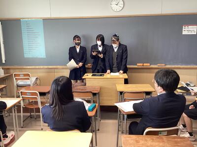 ・SDGs探究活動を振り返って、最初はテーマがまとまらず、スライドが完成するのか不安だったけれど、各メンバーが協力しなんとか形にすることができて良かったです。活動を行うごとにグループの協調性が高まっていき、互いに苦戦していた時は助け合えるようになりました。21日の全体発表に向けて、班のみんなで改善点や工夫点について話し合ったり、発表原稿を作ったり、緊張しないように何度も練習したりして、今までの活動の集大成を見せられるように頑張ります。