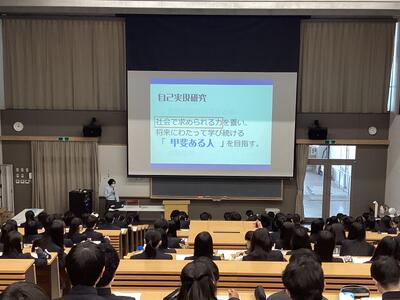 1点目は、「2年次の甲斐たいむについて」です。「甲斐たいむ」では何を学び、何を身に付ける学習なのかや、社会に出たときにどんな力が身に付いていると良いのかなどの話を聞きながら、生徒同士で話合い、自分の考えを共有しました。また、進路につながっていく学習であることを再確認し、変化し続け、想像のつかない未来をどう切り開いていくのかを見付けられるようにと、探究への意欲を高めていました。