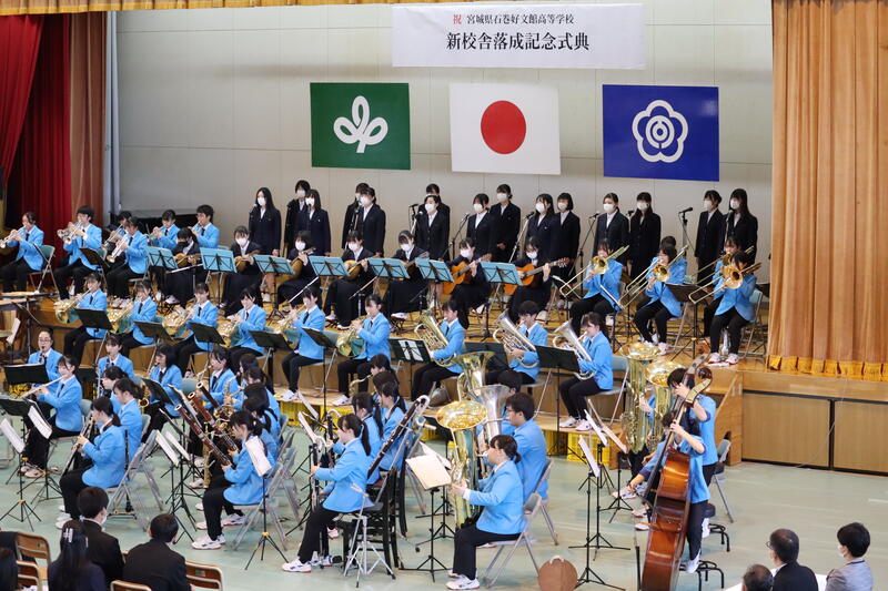 5月25日(水)13:30より新校舎落成記念式典が行われ,100名を超える来賓の方々の臨席のもと,全校生徒,職員一同で白亜の校舎の落成を祝いました。記念式典では,校舎完成に尽力頂いた各社,そして高橋実行委員会会長へ感謝状が贈呈され,来賓から祝辞を頂きました。続いて,生徒会長の中村さんが「校舎の完成を,プレハブ校舎から期待に胸を膨らませて眺めたこと,真新しい校舎で,さらに勉強への意欲が増したこと」を話しました。式典に続いて,マンドリン部,音楽部,吹奏楽部による記念公演が行われ,最後は三部合同の「花は咲く」で華を添えました。これまでの伝統に加えて,新たな好文館の一ページを作られることを期待します。
