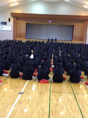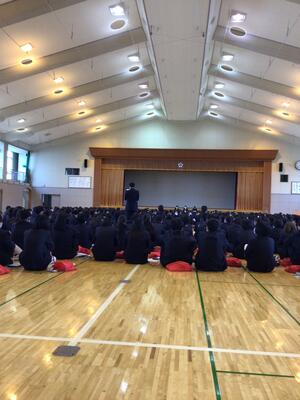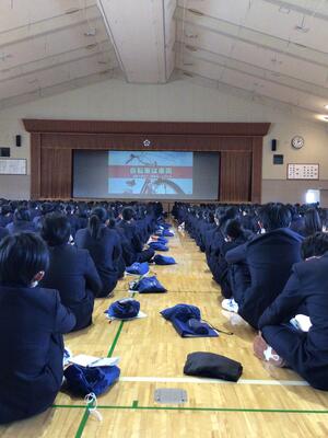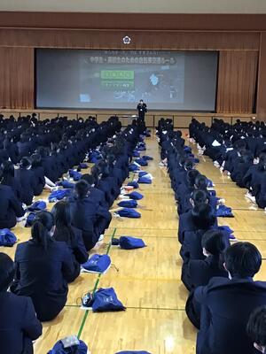 5月11日に交通安全講話を実施しました。石巻警察署から講師をお招きして,通学する際の注意事項について学びました。自転車の利用者が,過去に県内でも加害者となった交通事故があったこと。自転車は軽車両に分類され,車と同じであり,県の条例で自転車損害賠償保険に加入義務があることを学びました。また,見通しの悪い交差点で事故が起きやすいことを学びました。加害者にも被害者にもならないよう,交通ルールを守って安全運転しましょう。